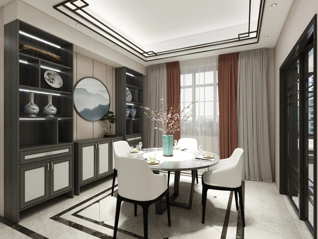 簡約式原木黑布紋電視柜、茶幾與新中式沙發座椅相得益彰,電視柜左右兩側各擺一裝飾花瓶,局部的小對稱充滿了“小心機”,讓空間更顯方正大氣?;ㄆ恐幸荒t色的點綴,瞬間便讓空間頓時鮮活起來。